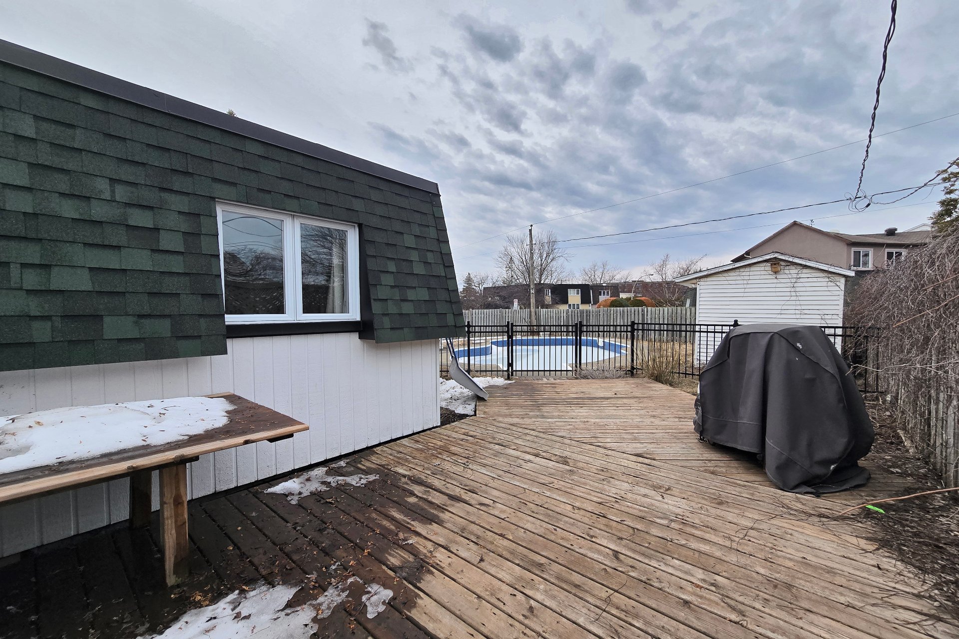 Stores, rideaux, tringles à rideaux, piscine creusée et accessoires, chauffe-eau de piscine, chauffe-eau, fournaise au gaz naturel, thermopompe, lave-vaisselle, hotte de cuisinière, luminaires, cabanon, banc de pierre dans la cour.
